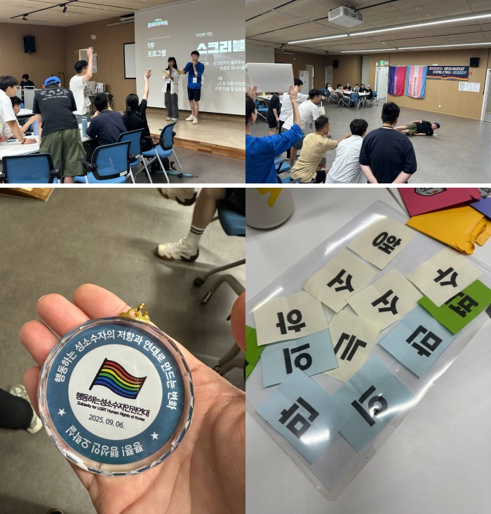 오락실에서는 놀라운 토요일, 스크리블 타임, 몸으로 말해요, 카드 뒤집기, 이심전심, 공굴리기 등 총 6가지의 본 게임, 그리고 보물찾기와 팀 미션이 진행됐습니다. 때로는 펜을, 때로는 온몸을 바쁘게 움직이며 다양한 놀이들을 만끽했습니다. 우승팀과 MVP에게는 행성인의 비전이자 팀 미션 문구였던 “행동하는 성소수자의 저항과 연대로 만드는 변화”가 적힌 기념메달과 부상이 주어졌습니다. |