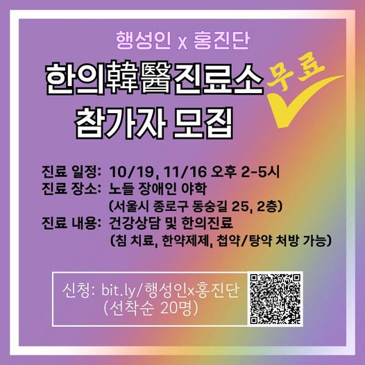 행성인과 홍진단(성소수자와 함께하는 한의사/한의대생 모임)이 작년에 이어 올해도, 성소수자 대상 일일 한의진료소를 운영합니다!